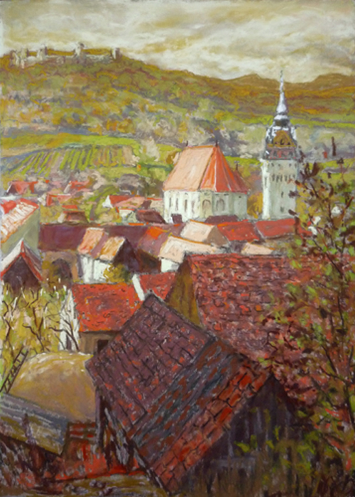 Saschiz Church and Fort, Evening Light (Pastel) 17.5" x 12"