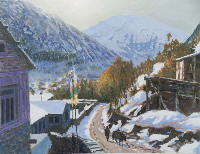 Track into Pisang, Morning, Nepal (oil) 23" x 31" £3950