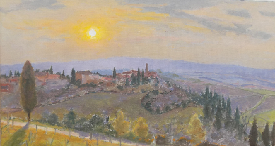 Sunset over Vico D'Elsa, Tuscany (oil on canvas) 9" x 18"